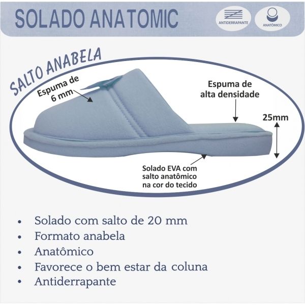 Pantufa Anatômica, conforto e estilo nessa linda pantufa com salto que acompanha a anatomia dos seus pés proporcionando um andar firme e postura correta à saúde eliminando dores nas pernas e garantindo uma sensação de bem estar única. Além de deixar o produto elegante, a espuma que utilizamos na planta do pé desse produto é de 10 mm de altura; isto garante conforto ao pisar, durabilidade e maciez. Parte superior do produto também é composto de uma espuma firme, deixando-o armado, sempre pronto para ser calçado, evitando assim o ato de abaixar para levantar o cabedal e depois inserir o pé. Malha 100% algodão com toque pelúcia produzido com fibras das melhores safras, com processos especiais de limpeza, o toque de nossas Malhas 100% Algodão se torna muito especial, apresentando uma superfície lisa e sedosa.