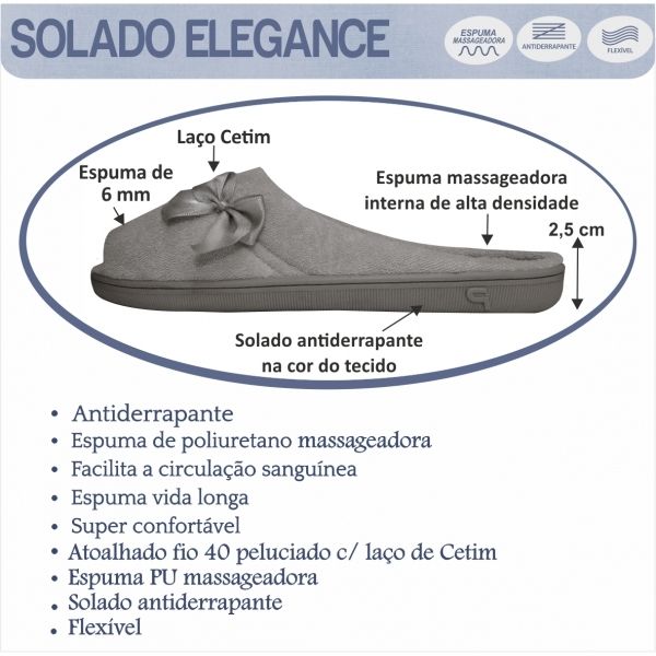 Outras Características | Atoalhado fio 40 peluciado c/ laço de Cetim Espuma PU massageadora Solado antiderrapante Flexível |