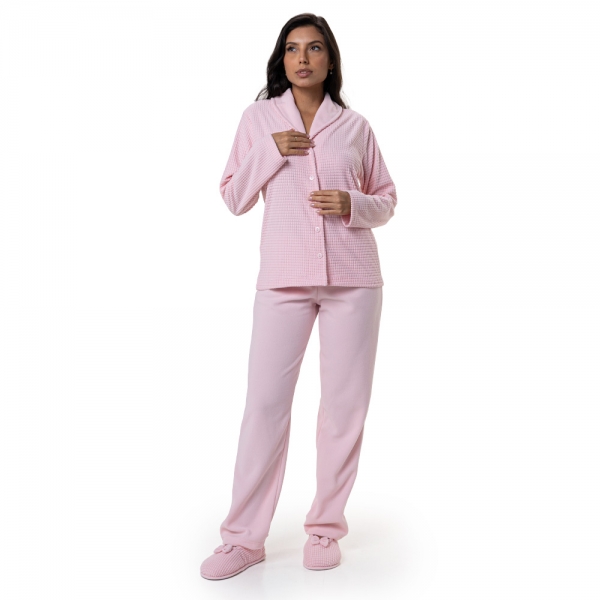 Pijama em Ultrasoft Grid com Abertura em Botões - Rosa